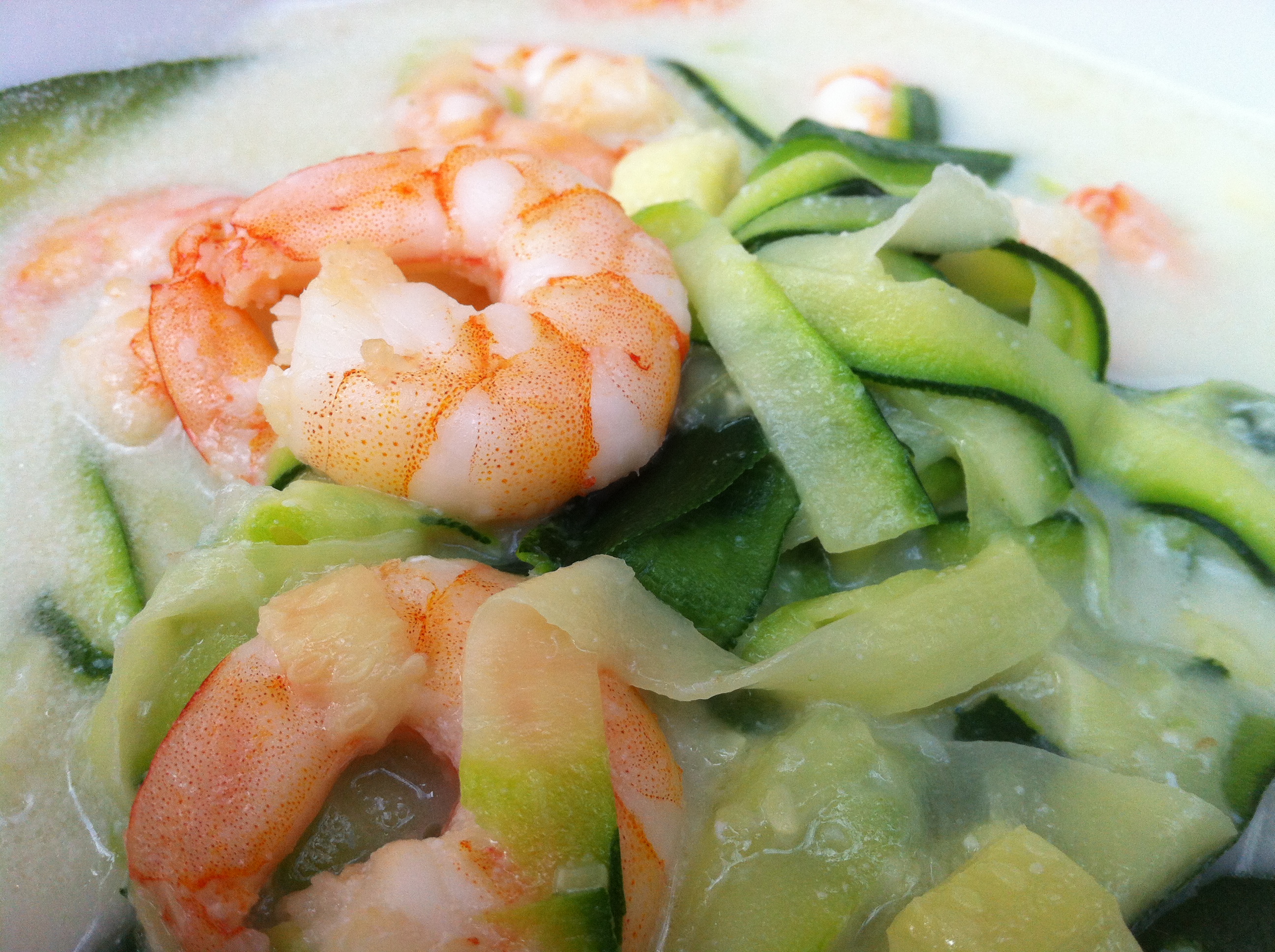 Once the prawns have turned pink add the prepared zucchini noodles to the coconut milk, stir in to ensure they’re submerged and soaking. Continue to cook on a medium heat for a couple of minutes until the noodles have reached a consistency you like. Personally I cooked them a little al dente as I liked the crush on the outside but soft in the middle. Add some white pepper as required and if desired.