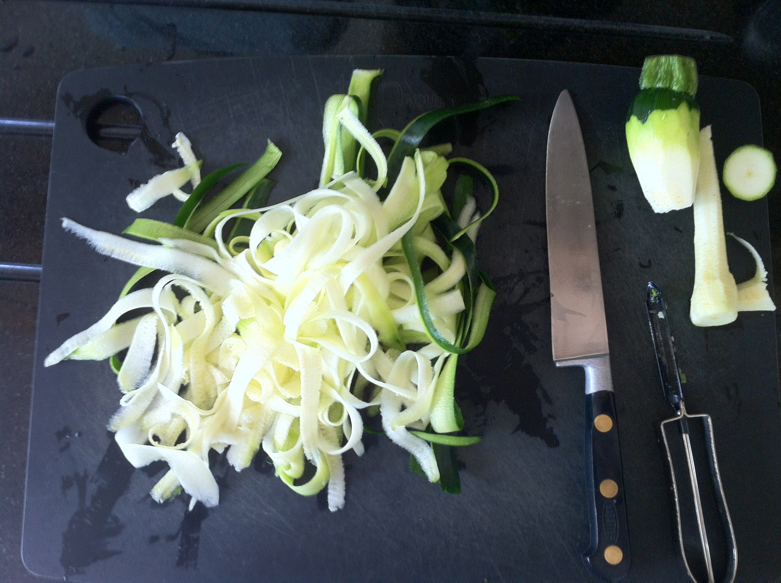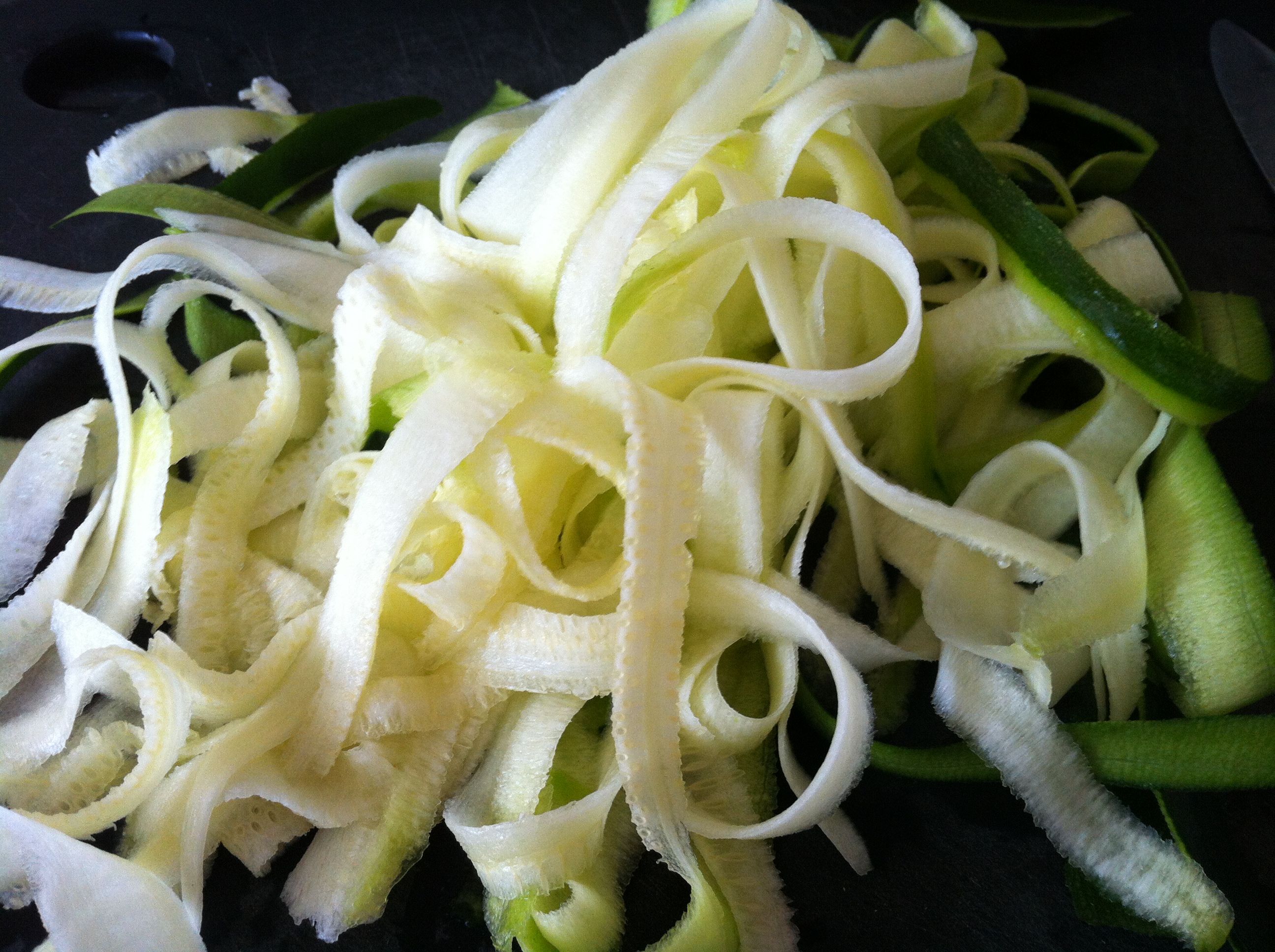 Personally, what I did was take the bottom off the courgette but leave the head of the courgette on; this will form your ‘handle’. Then I simply peeled the courgette lengthways, rotating the courgette as I did it; this rotating technique allows you to get a fairly consistent size for the noodles. I personally found this technique fast and easy to do but I may need more practice at doing it the way urbanpaleochef recommended.