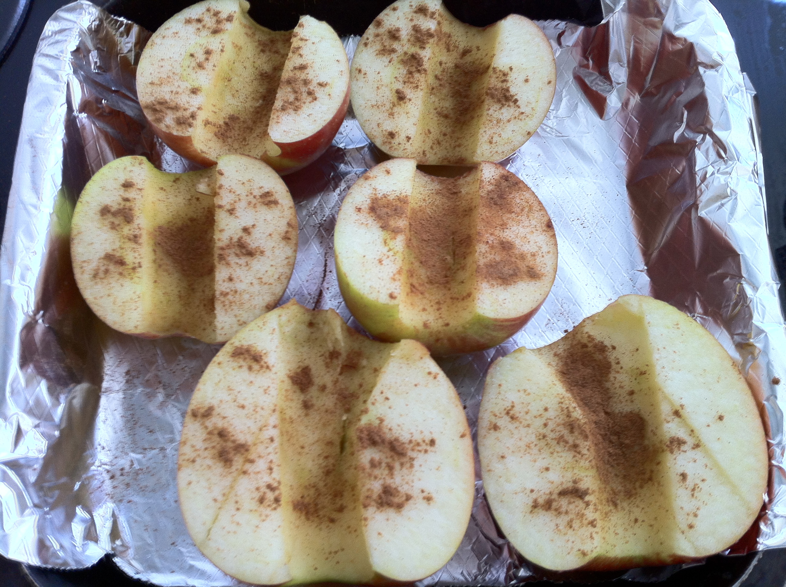 Take the cinnamon into your hand and sprinkle over the apples. Try to get an even covering of cinnamon on the apple to prevent any overly sweet areas; this can be tricky but not a major issue.