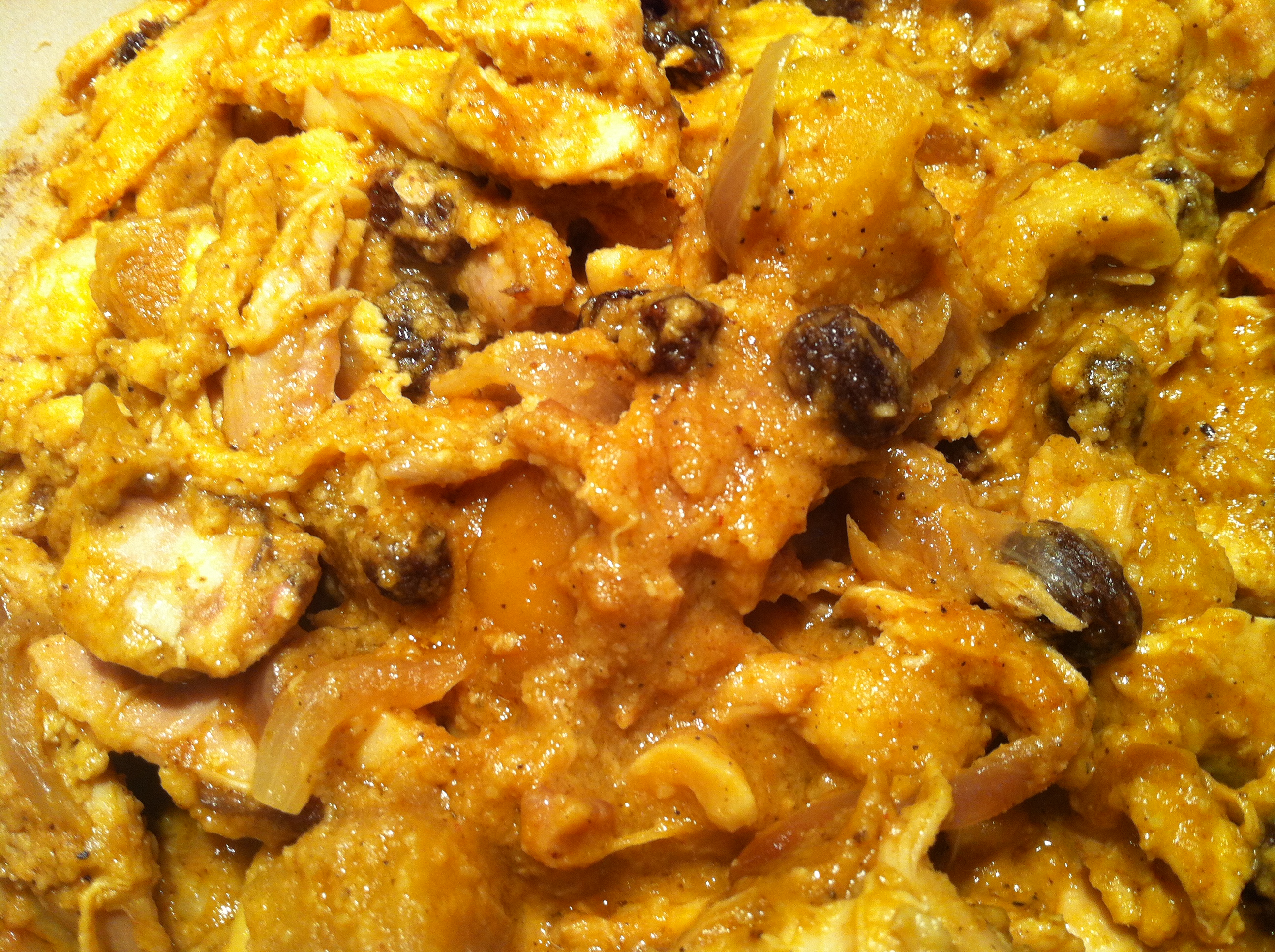 Add the coconut milk and the chopped cooked chicken to the curry sauce. The final part is to put the lid on the casserole dish and put it in the oven for 40 minutes.