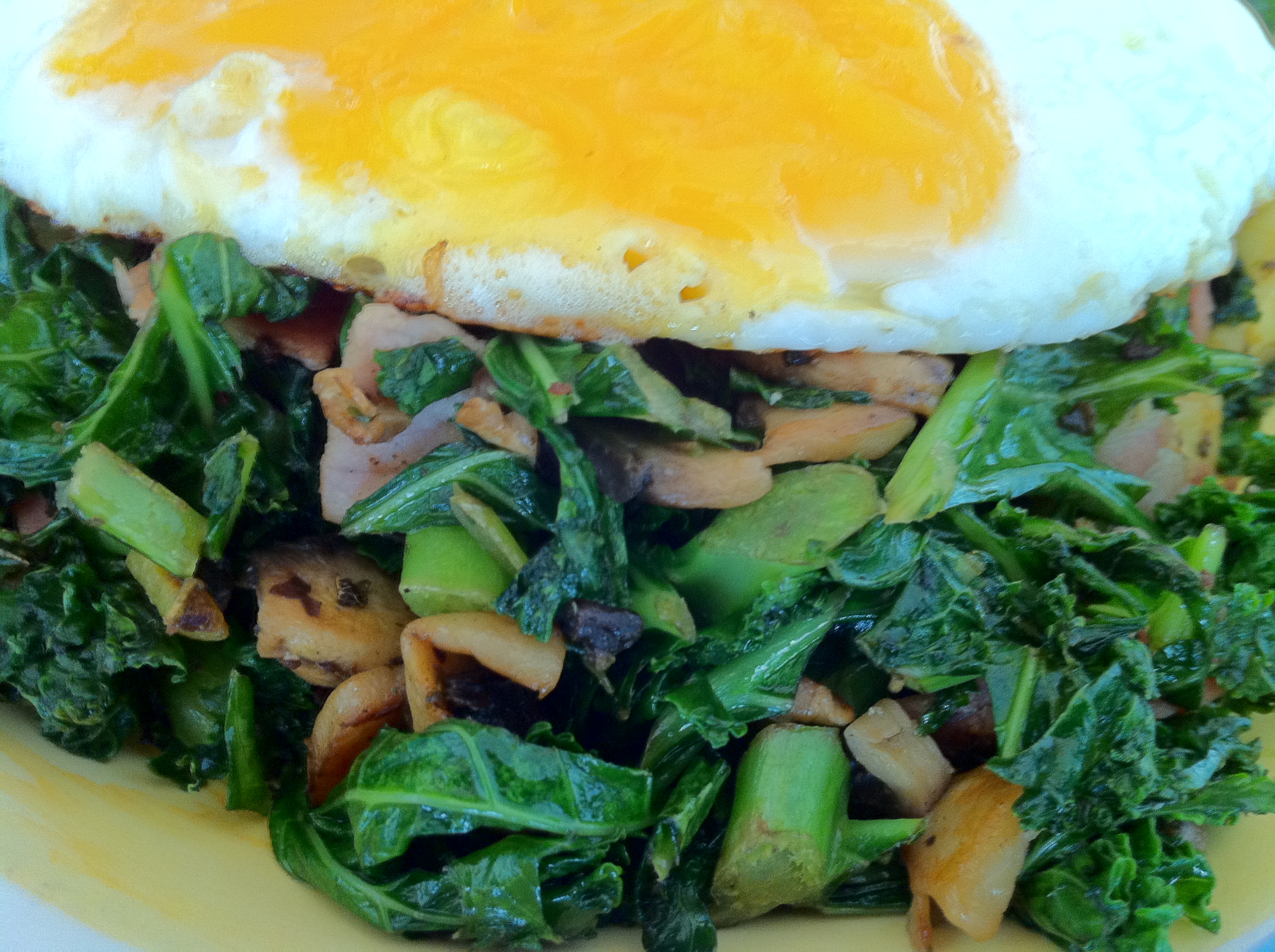 Once the kale is cooked down, add the bacon, mushrooms and zucchini, mix together and then put the fried eggs on top. Season with white pepper and serve with a nice cup of green tea or orange juice. Now relax and get ready to start your day on a high.