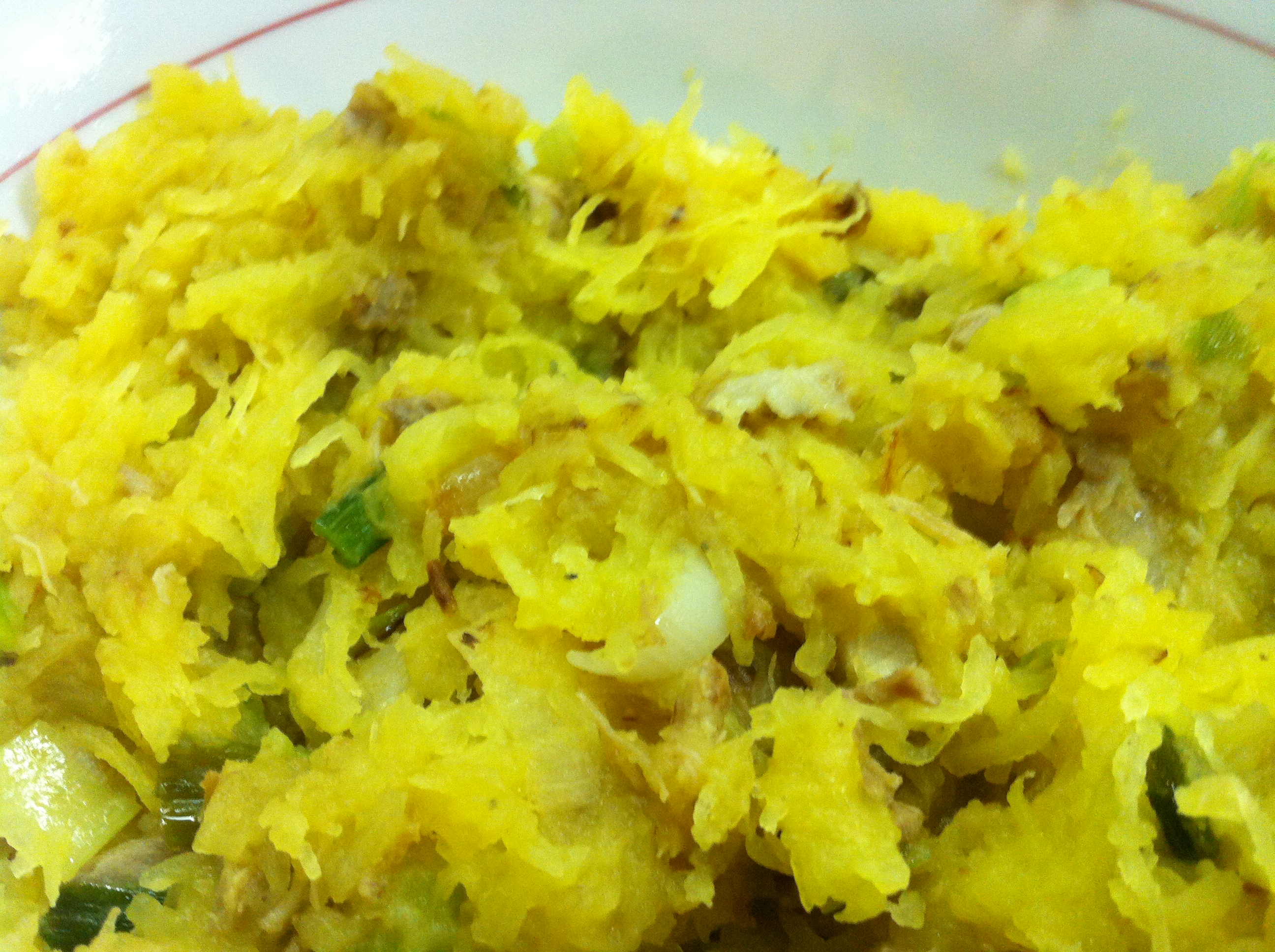 Firstly I’d like to say that this is a left overs recipe, I have used left over cooked pork and already cooked spaghetti squash so I’m not including them in my overall Preparation to Plate time. The meat can be substituted for any left over white meats you may have that are cooked, such as chicken or turkey, it may work with duck as well.