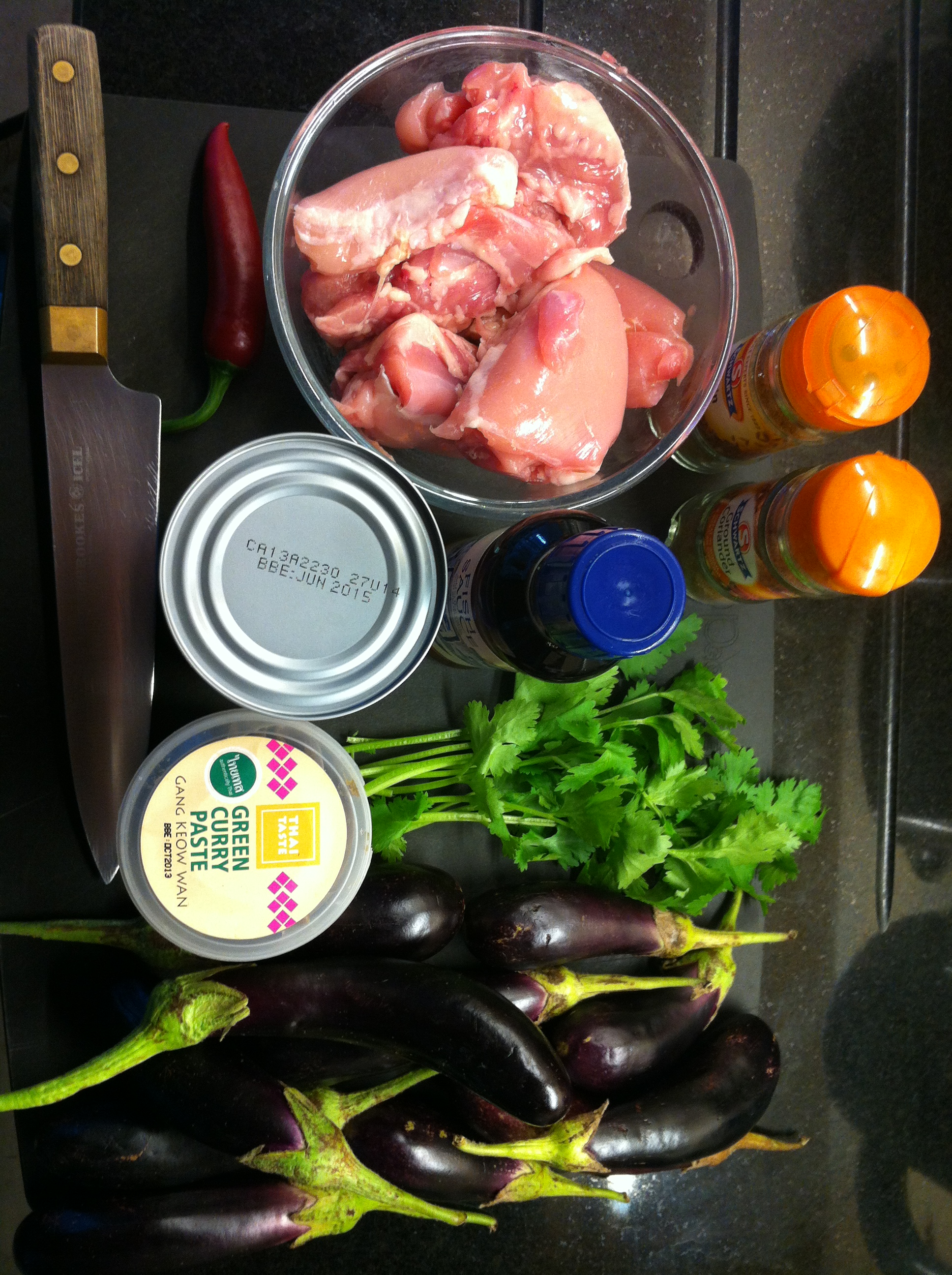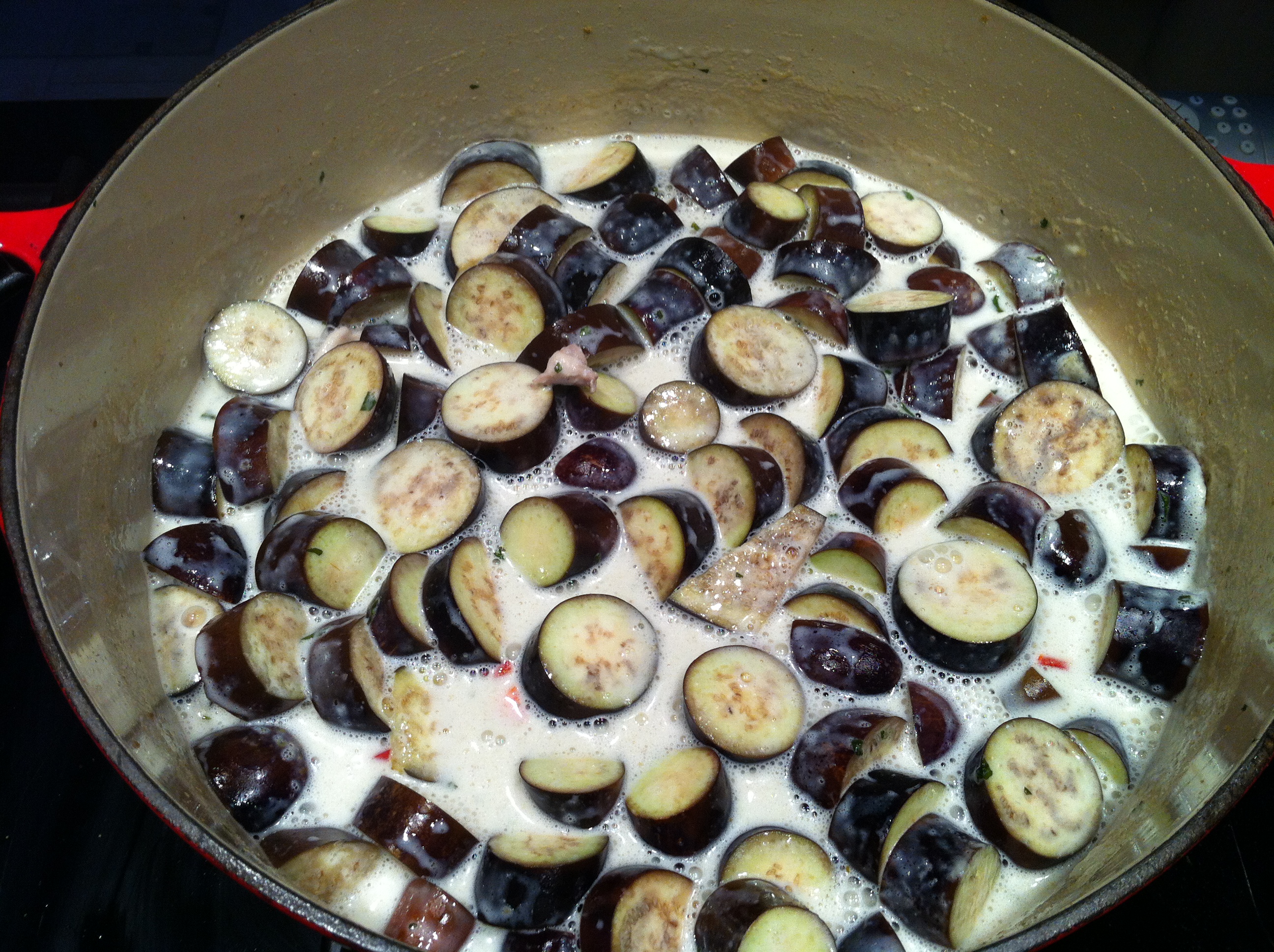 Add the coconut milk to the pan and turn the heat down to low. Stir to combine the herbs and spices with the coconut milk. Add the chicken thighs and turn the heat up slightly, cook until the chicken is cooked through, the smaller the bite size pieces the quicker it will be. Once the chicken is cooked add the aubergine and cook until soft. Don’t worry if it looks like you have prepared too many aubergines, they will shrink down as they cook.