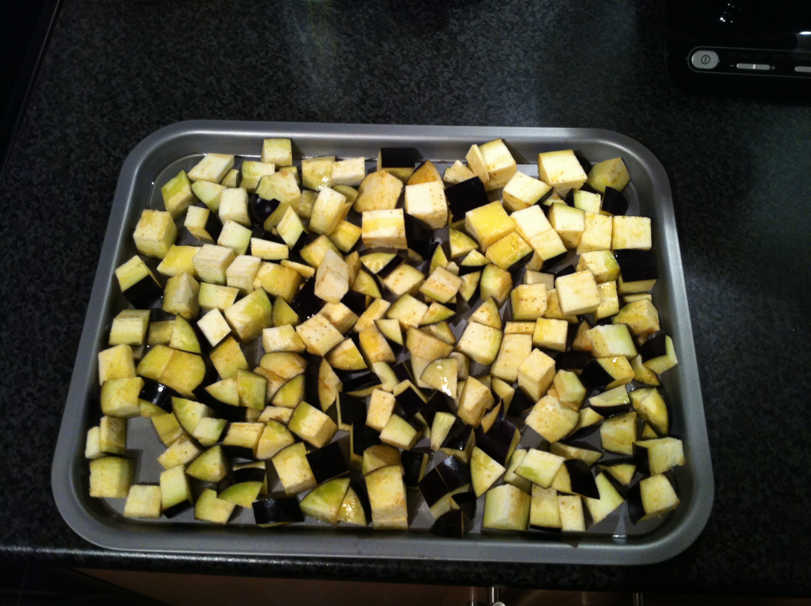 Preheat the oven to 200°C. Whilst the oven is heating up, chop the aubergine into rough cubes and place on a baking tray or in a roasting tin. Pour over a generous amount of olive oil (not extra virgin) and roast in the oven for 10-12 minutes.