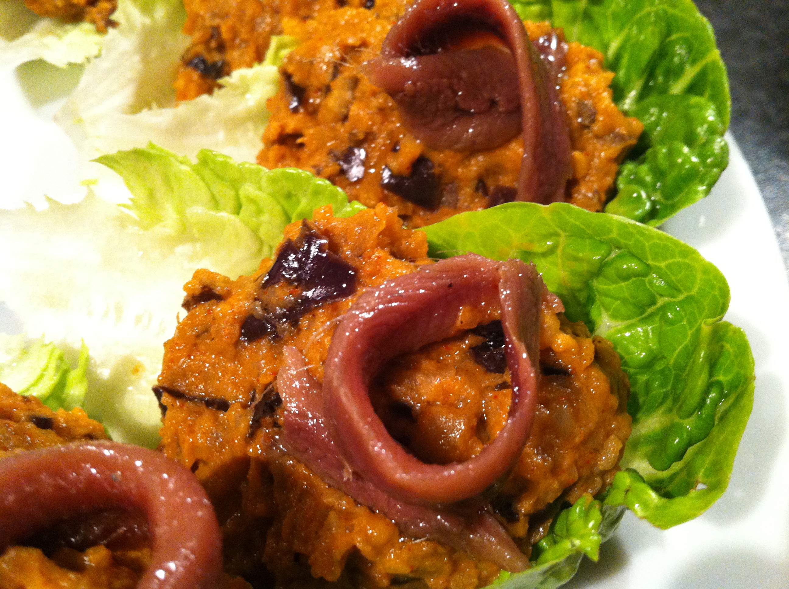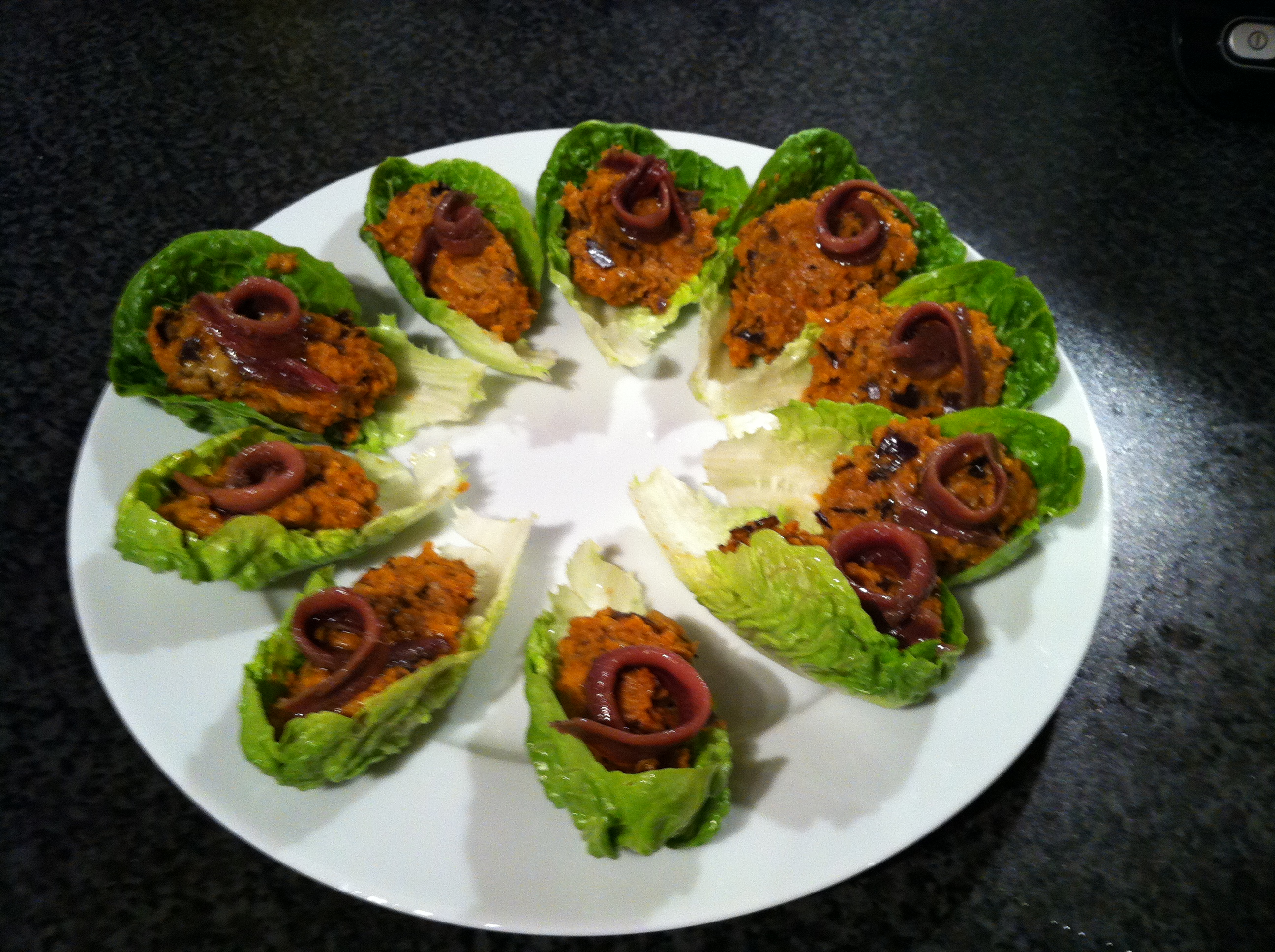 Use a teaspoon to spoon out a heap of the mixture onto a cos lettuce leaf, add an anchovy fillet (can display them however you like, I personally chose a curl) and serve.