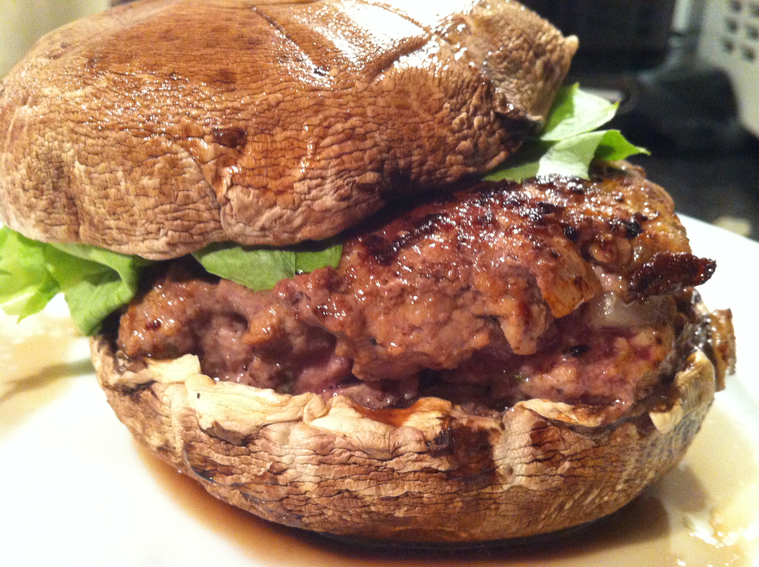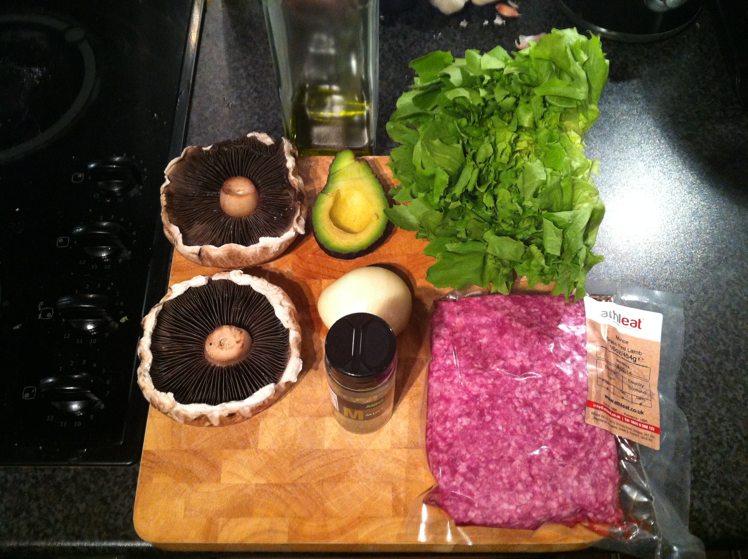 On top of a portobello mushroom dollop a small amount of homemade mayonnaise and add the lamb burger on top. Scoop out around ¼ of an avocado and add plenty of fresh, crunchy lettuce on top of the avocado. Add a little more mayonnaise on top of the lettuce and top it off with another portobello mushroom (you may need a wooden skewer to hold everything in place). Obviously you can add what ever else you want, be it bacon, tomato, relish, gherkin etc and feel free to add a green salad salad, sweet potato or parsnip chips on the side.