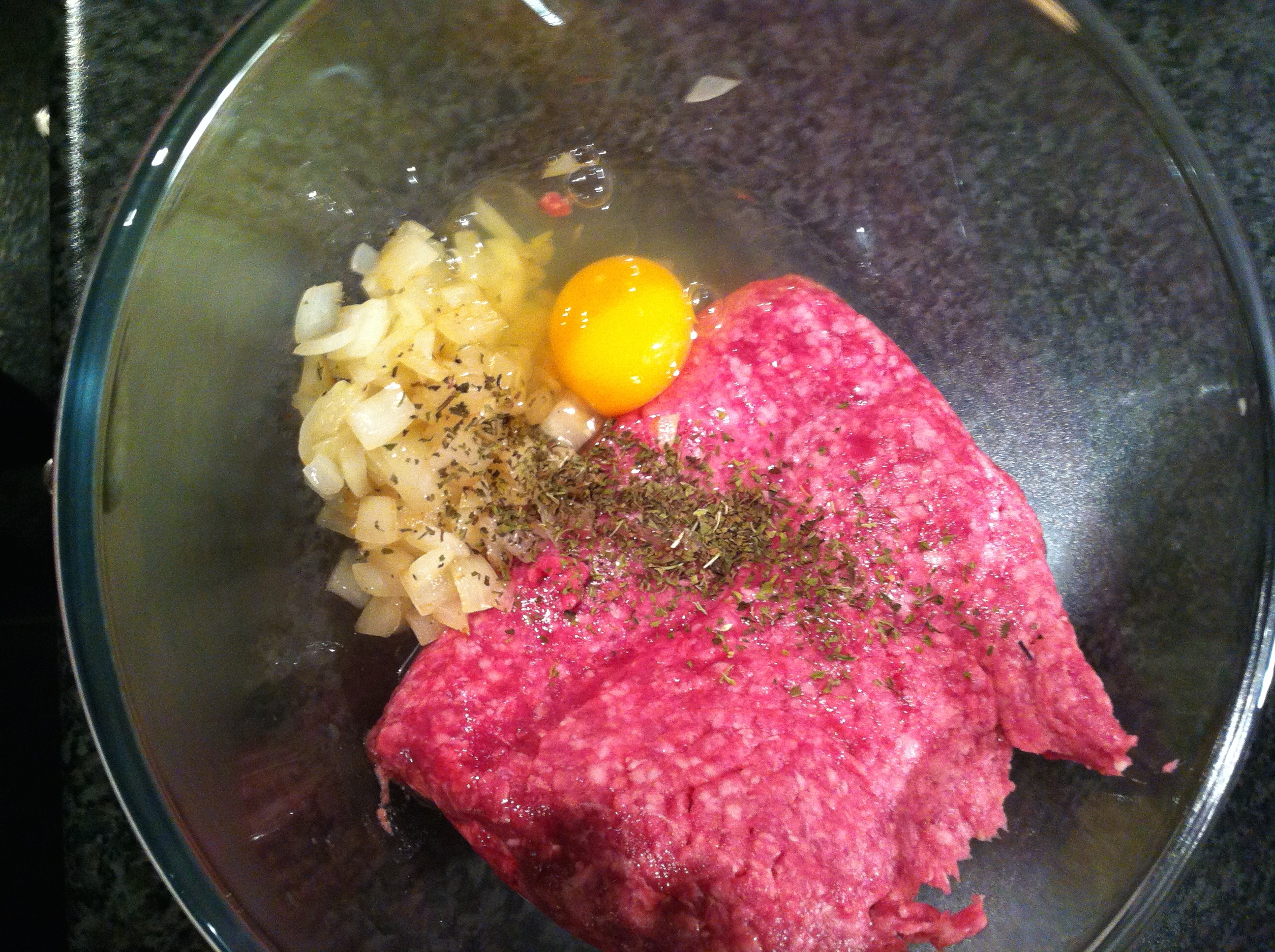 Once the onions are cooked place them in a large bowl along with the mince, egg and dried mint. After ensuring your hands are clean, combine the mixture with your hands until everything is combined. Once combined divide the mince into four even amounts and pat into burgers. As you can see I didn’t quite get my ratio right.