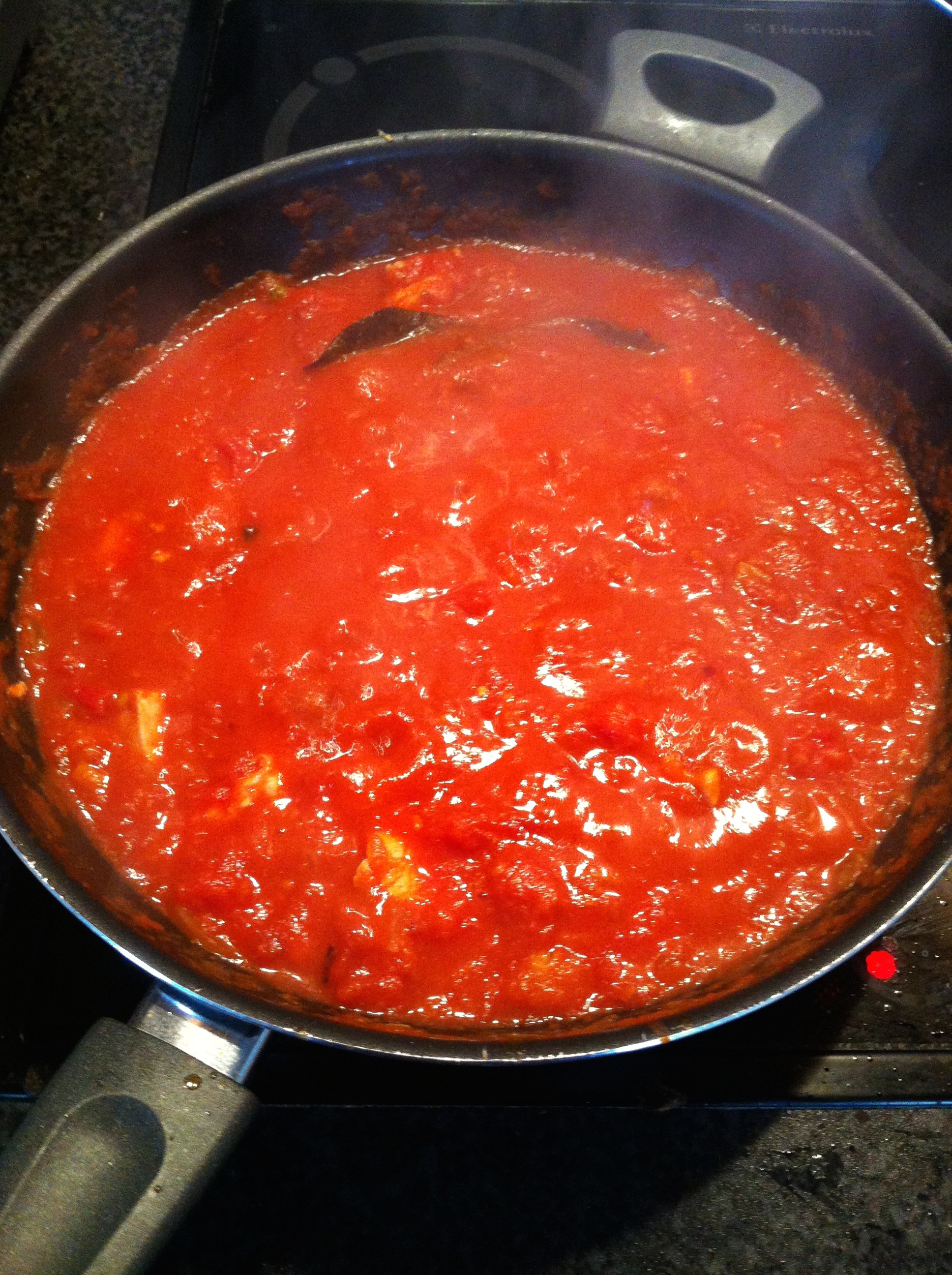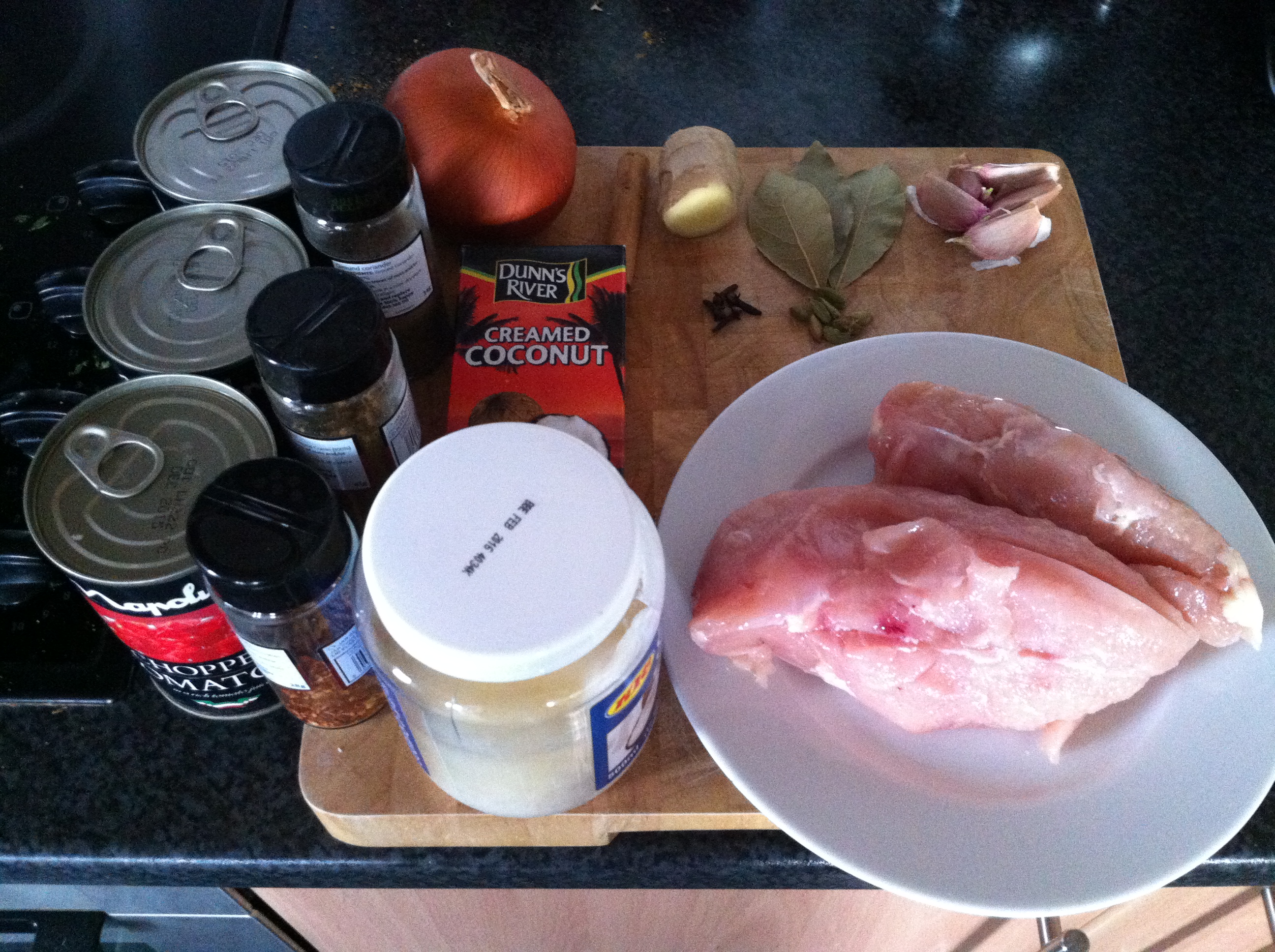 Once the onions are cooked and turning brown add the grated garlic and ginger as well as the rest of the ground cumin and ground coriander. Once these ingredients have been stirred in and infused turn down the heat to low-medium add the cans of tomatoes. Once an aroma has developed add the chicken and chilli powder/flakes to the mix. Cover and cook over a low heat for at least 30 minutes, stirring occasionally to prevent the tomatoes from burning.