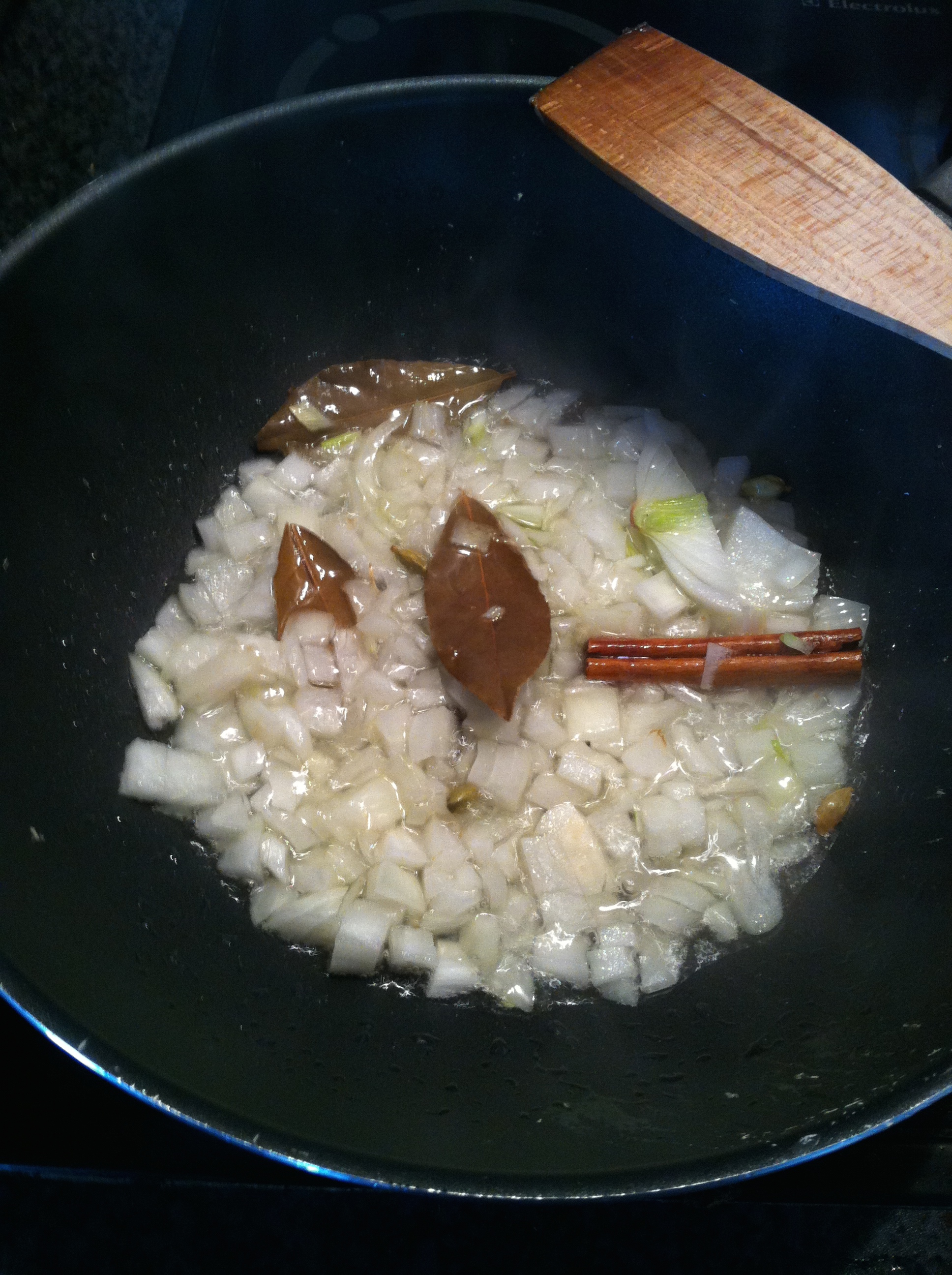 Melt the coconut oil in a large pan/skillet over a higher heat. Once the oil is hot add the bay leaves, cinnamon, cardamon pods, cloves and ½ tbsp of the ground cumin. Stir for a minute before adding the onions.