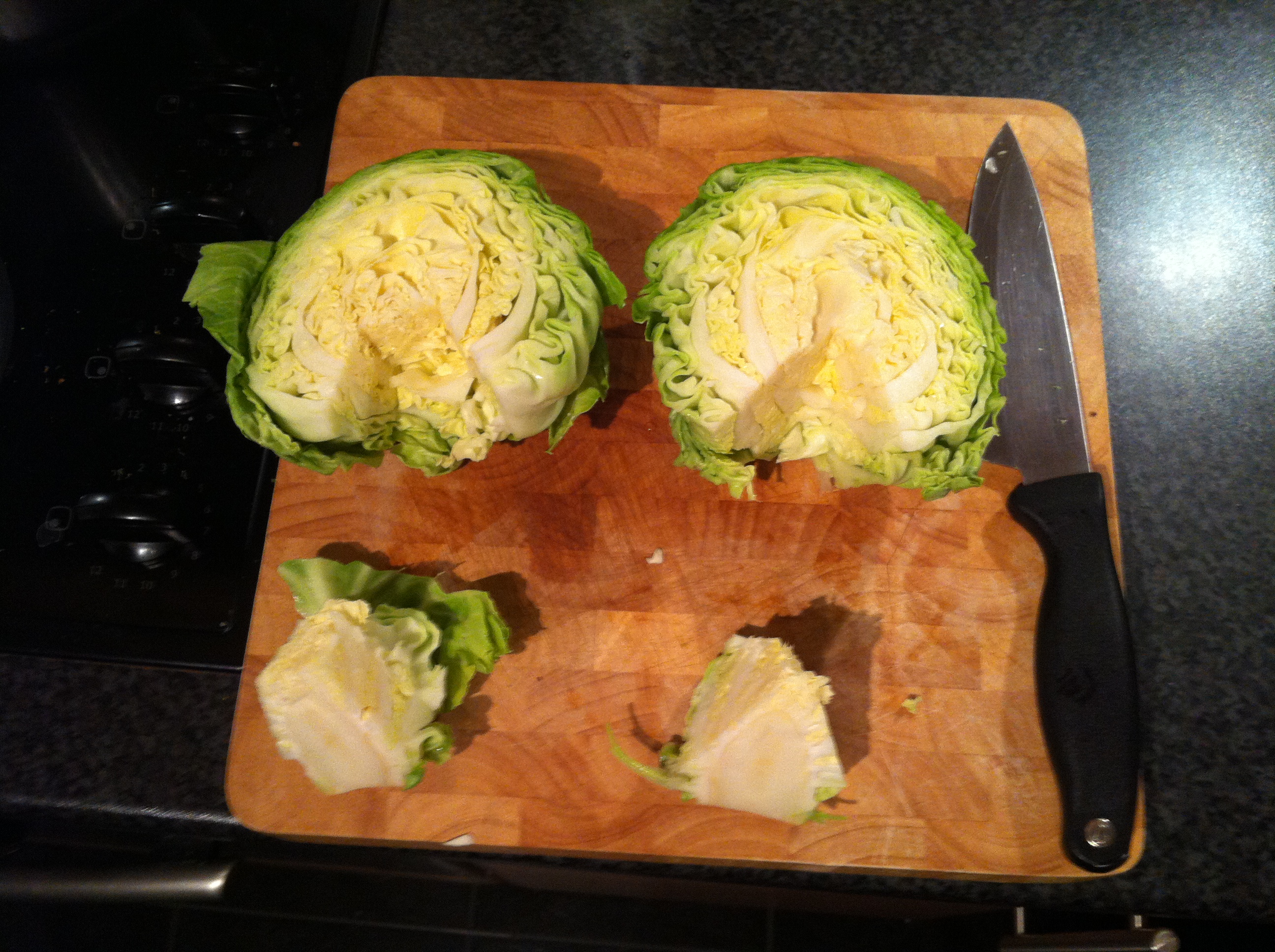 Firstly remove any straggly leaves from the outside, much as you would do for a cauliflower, but leave the lightly wrapped leaves in place. Now slice the cabbage in half, length ways.