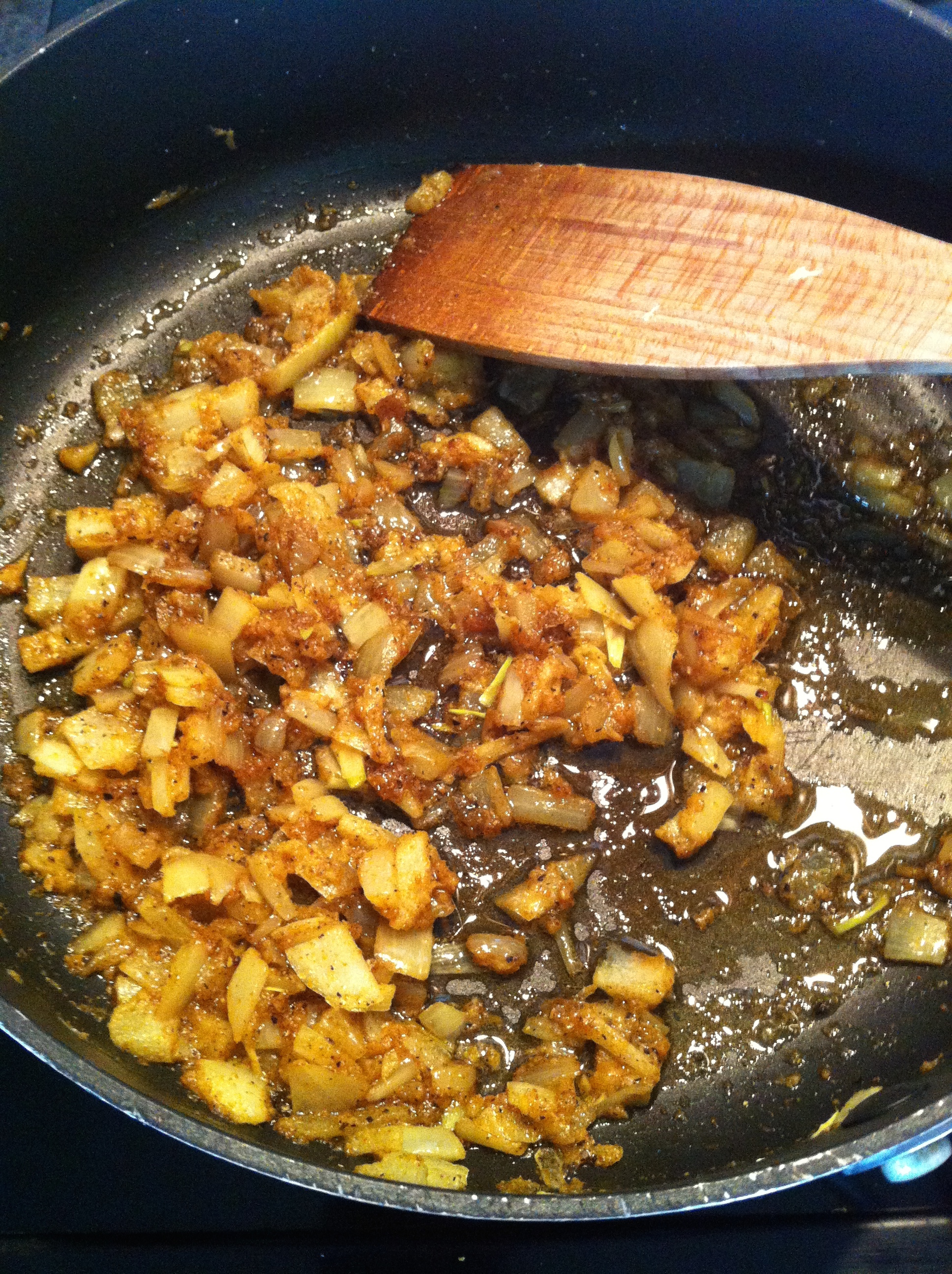 In a large pot put the coconut oil, chopped onion, garlic, ginger, curry powder, ground cloves and black pepper, cook over a medium heat until the onions are soft and translucent.