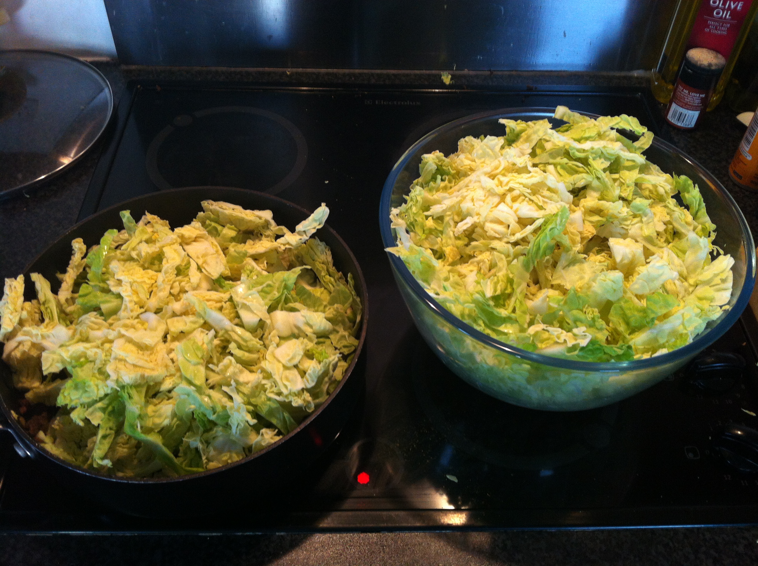 Once the onions are soft add the minced beef and stir into the pot. Once the mince is almost completely browned start adding the cabbage.