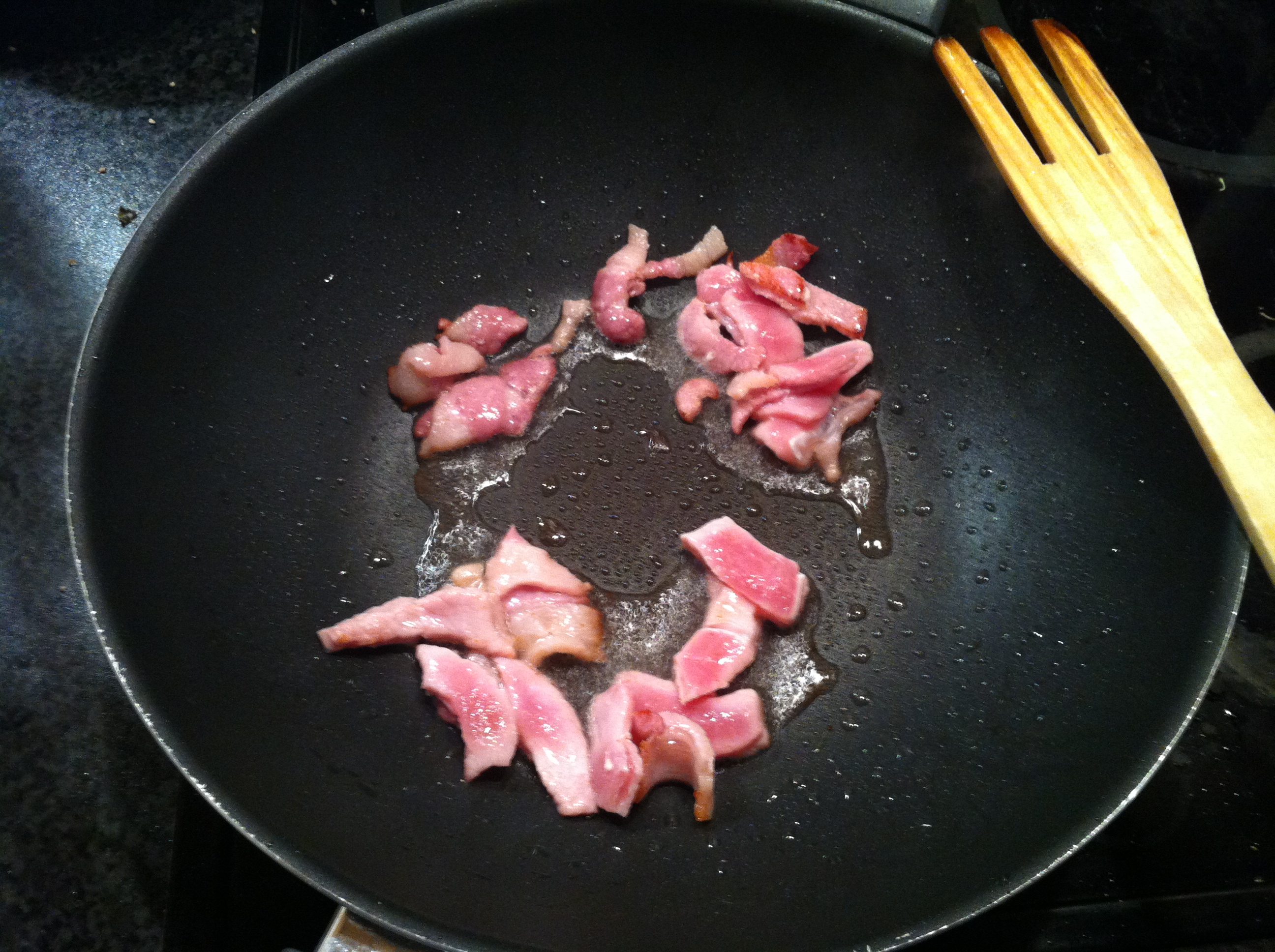 In a frying pan or skillet heat the coconut oil over a high heat, once melted snip in the bacon rashes. Cook for a couple of minutes until the bacon starts to brown at the edges and it loses its translucency.