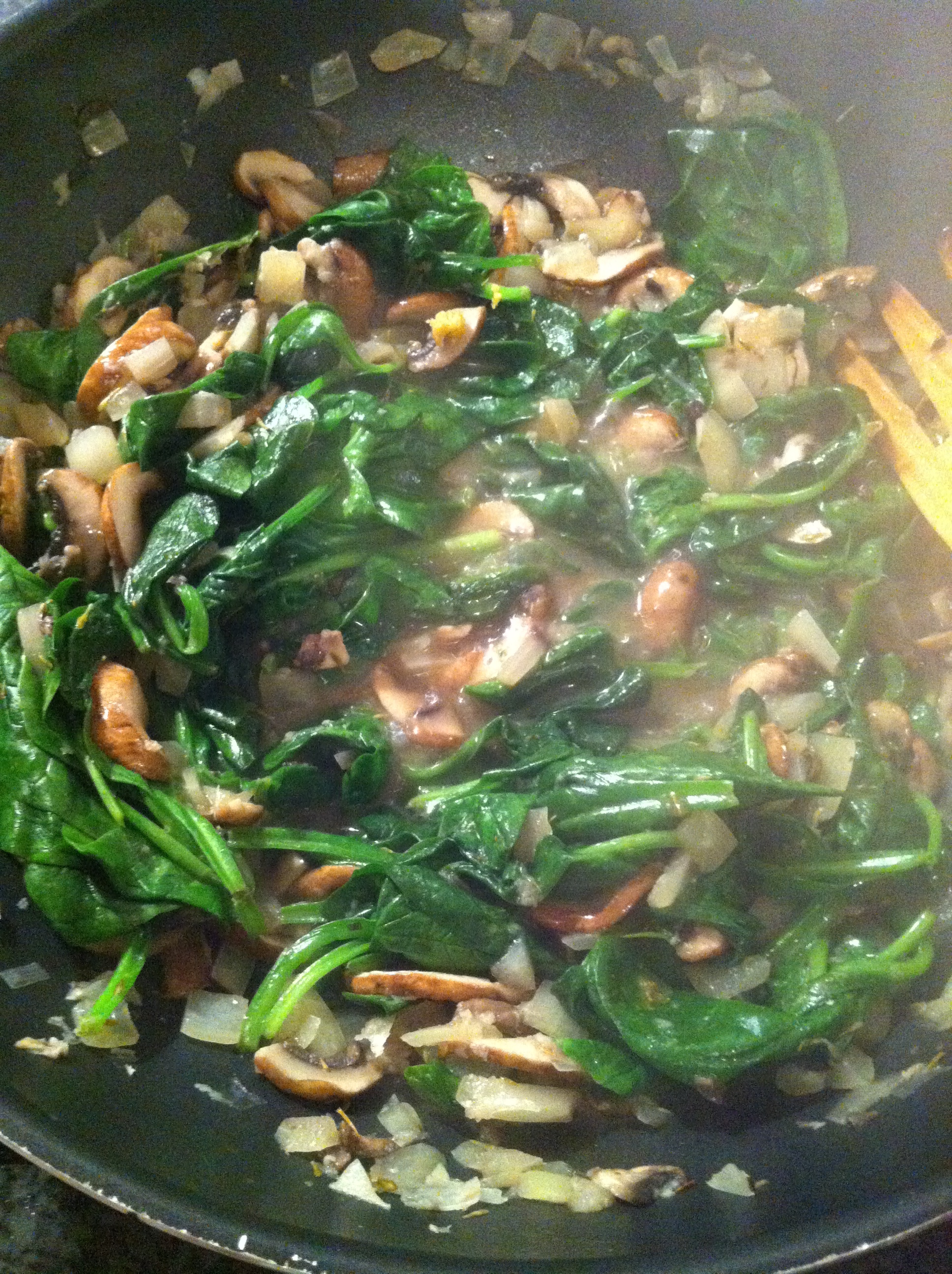 Once the mushrooms are done add the spinach and clamp on a lid to allow the spinach to wilt down. Once it has started to wilt, mix in well with the rest of the risotto mix.