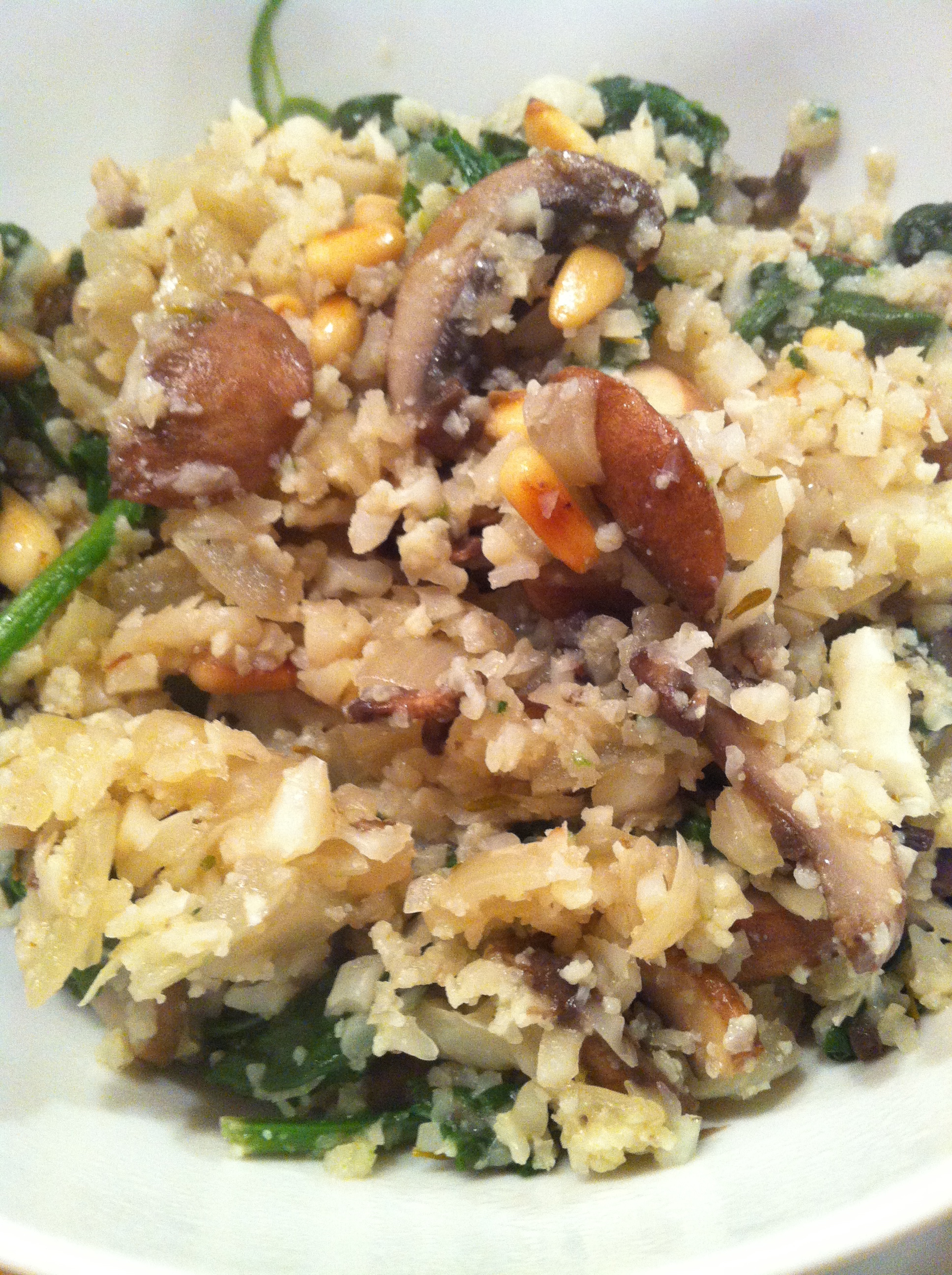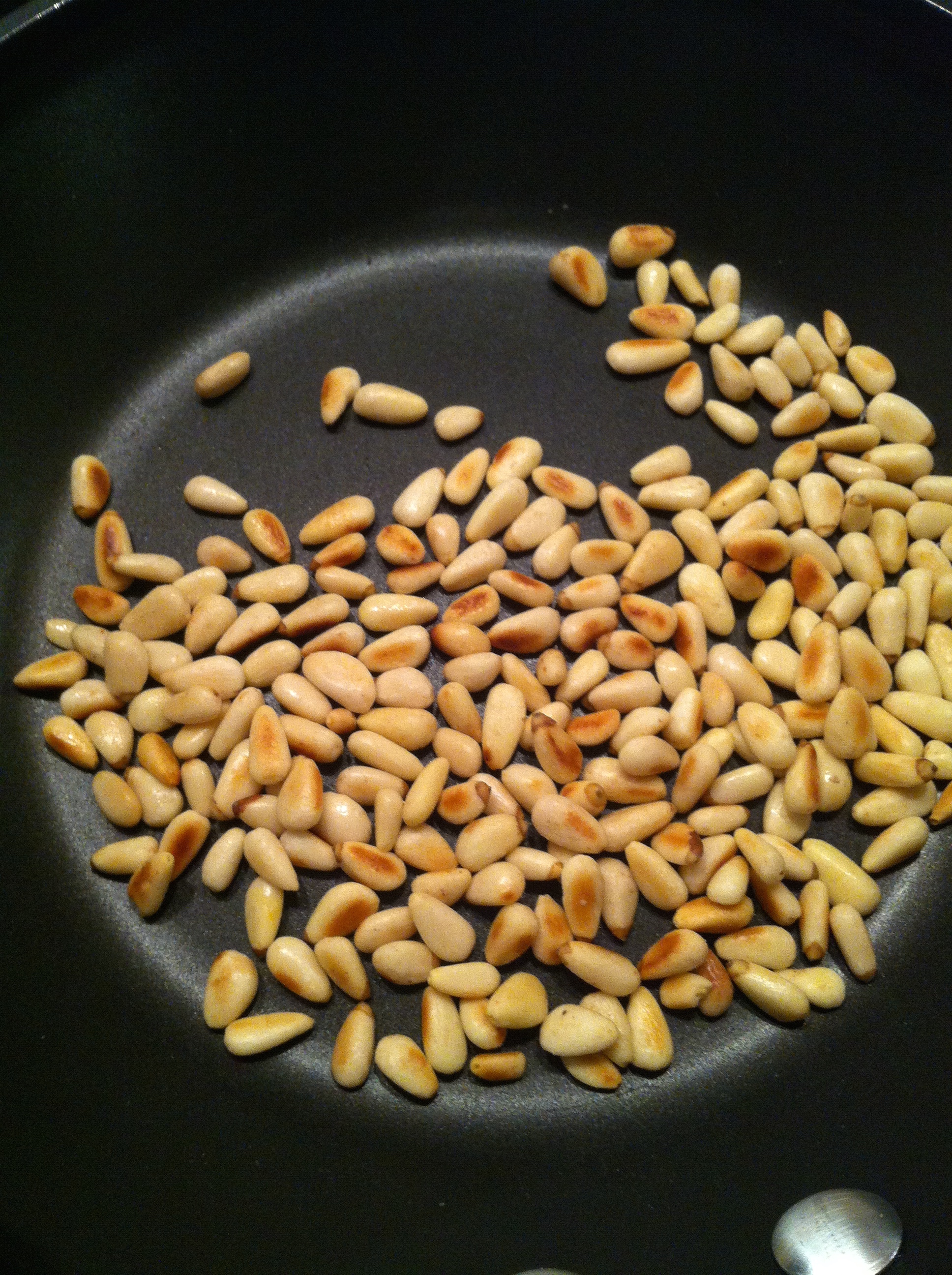 Add the cauliflower rice and stir in well, season with white pepper and continue to cook over a medium-high heat until the cauliflower loses it’s raw smell. In a separate, small frying pan, toast the pine nuts over a high heat. Ensure you keep the pan moving and don’t leave for too long. They should take between one to two minutes to become toasted.
